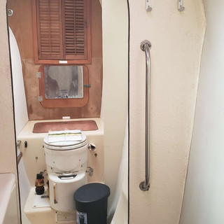 Trampolines forward and aft, two queen staterooms, a large settee and chart table, good sized galley and a large head with a shower make her a very comfortable liveaboard for us. We bought her in 2019 and installed